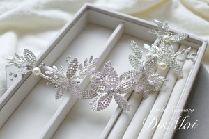 たくさんのクリスタルストーンでかたどられた透け感のあるリーフ&フラワーモチーフと大粒のパールが主役のヘッドドレスです。