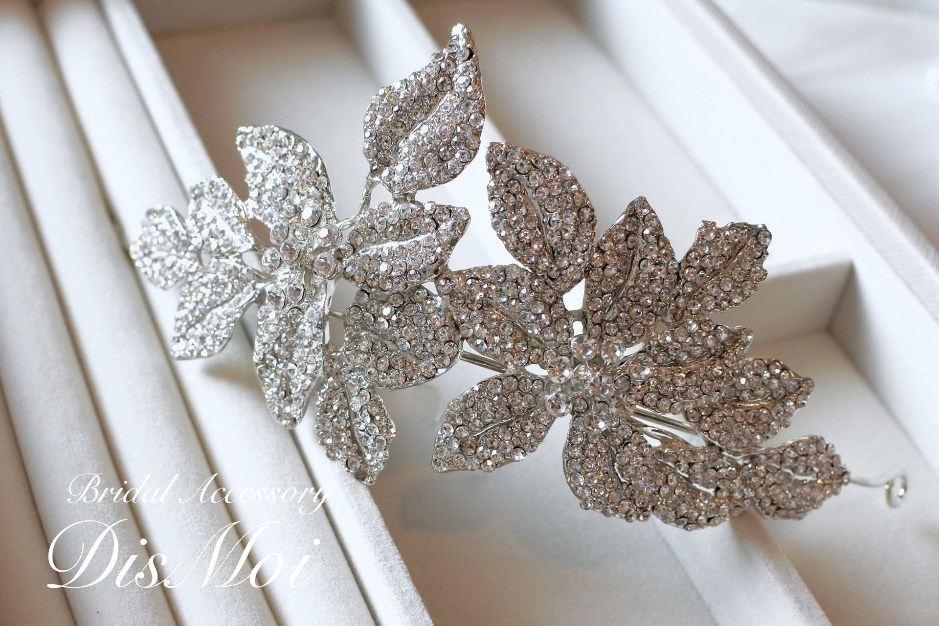 大ぶりのフラワー&リーフモチーフに敷き詰められた小さなクリスタルストーンが光を浴びて煌びやかに輝きます。