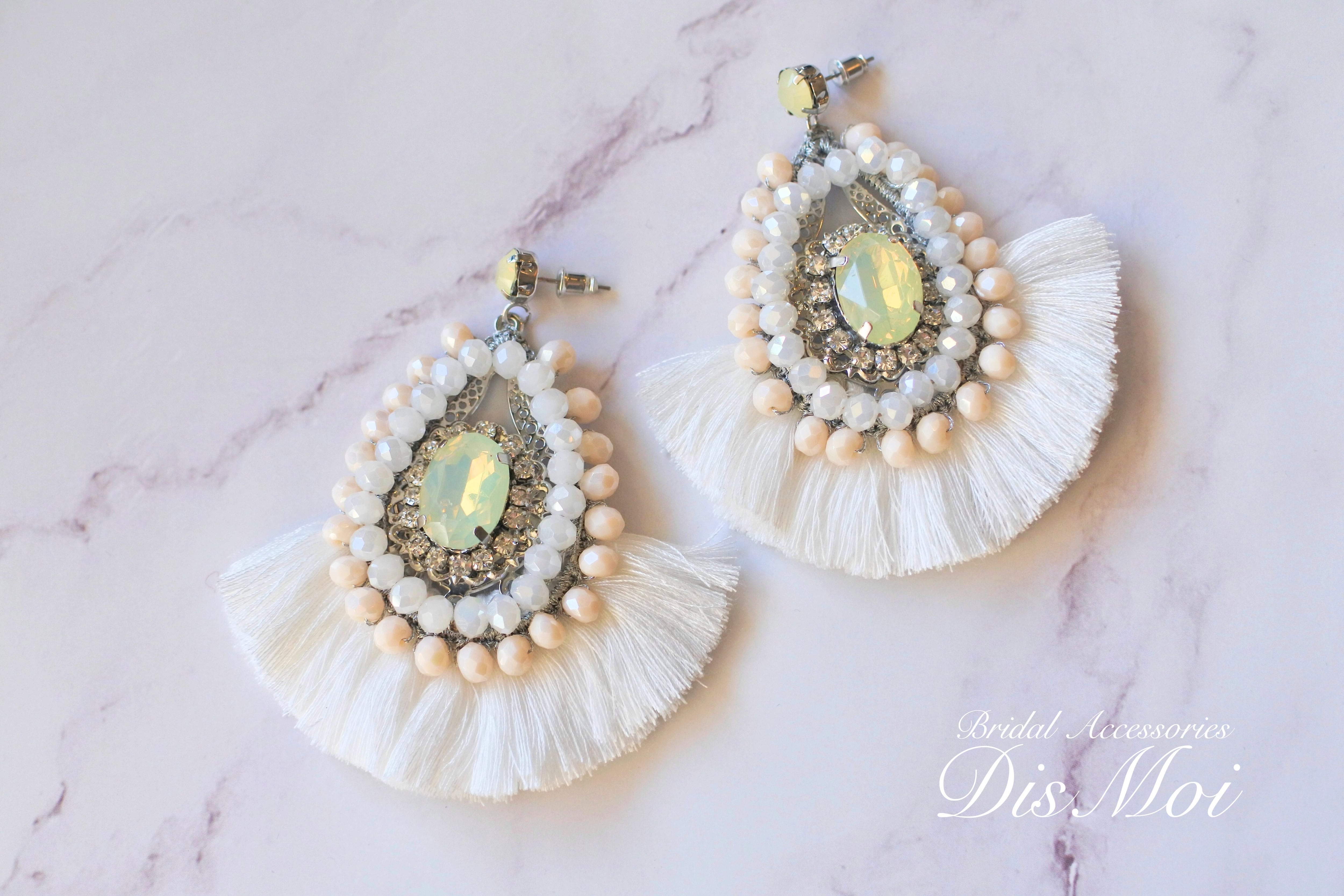 大ぶりのカラーストーンやフリンジが華やかなピアスです。