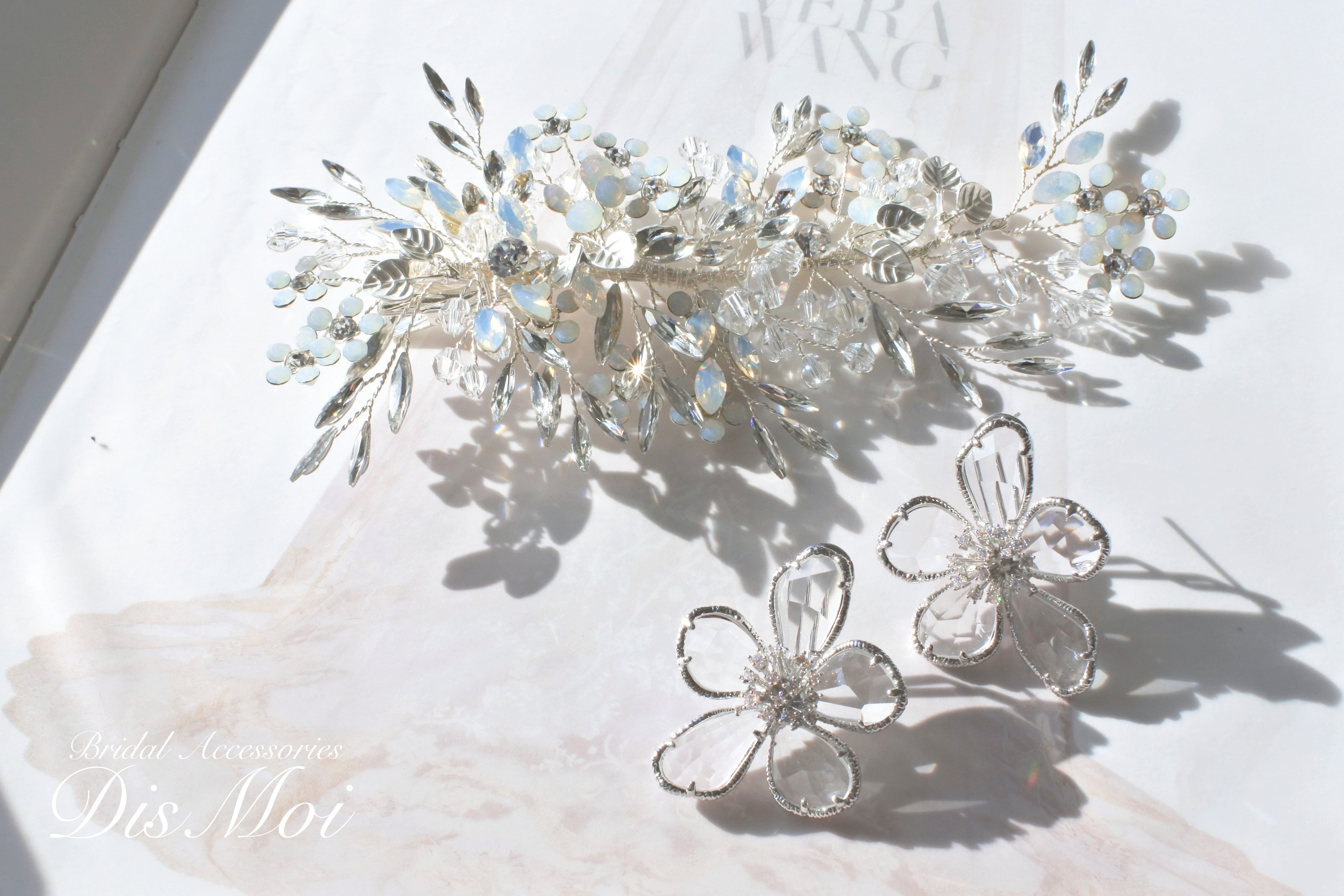 ホワイトオパールやクリスタル、クリアビーズが透明感のある輝きを放ちます。