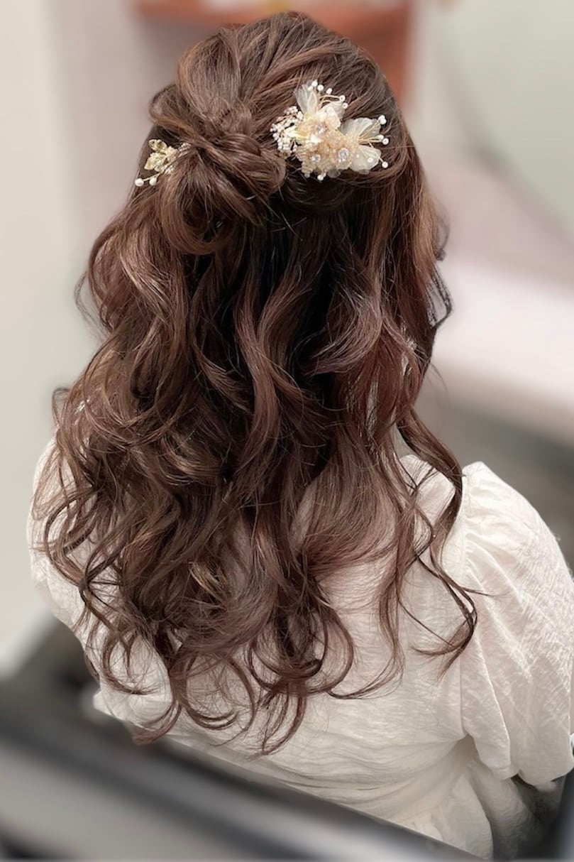 繊細なオーガンジー生地で出来たフラワーモチーフは透け感があり、花嫁ヘアをナチュラルに演出してくれるデザイン。